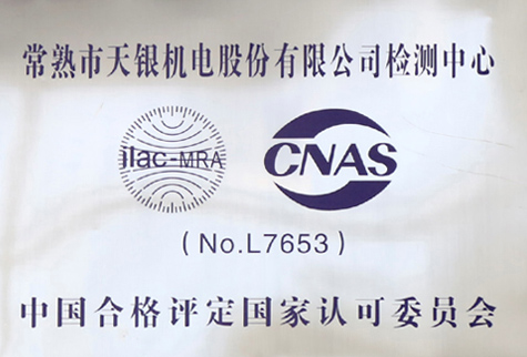 常熟市天銀機電股份有限公司檢測中心于2015年4月首次通過中國合格評定國家認可(CNAS)認可。檢測中心配備各種測試儀器和分析儀器,可提供工作性能試驗、安全性試驗、可靠性試驗等檢測項目。